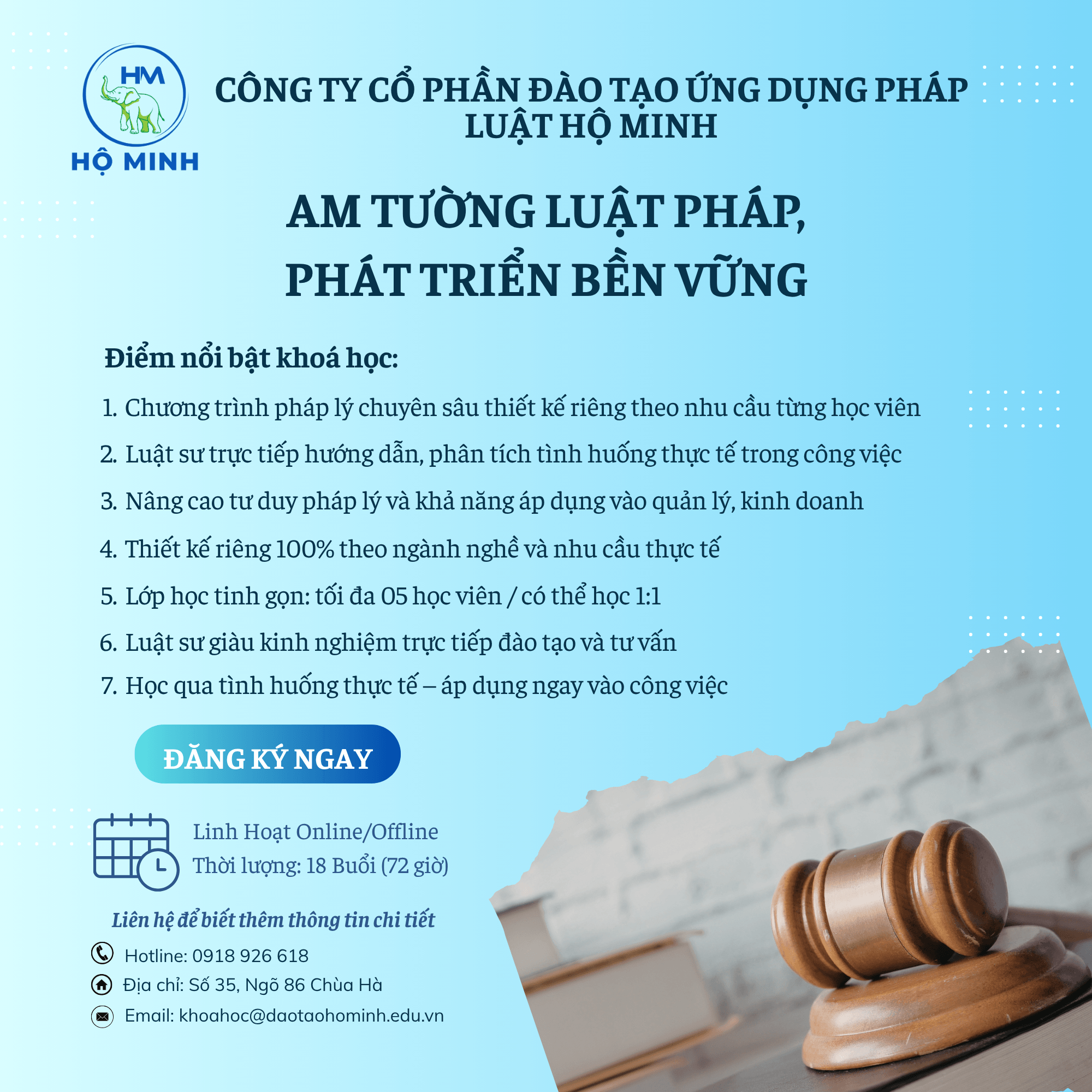 “Am tường luật pháp, phát triển bền vững” là khóa học pháp lý cao cấp được thiết kế riêng cho từng học viên hoặc nhóm học viên có chung lĩnh vực công việc. Nội dung khóa học được xây dựng dựa trên đặc điểm nghề nghiệp, môi trường làm việc và nhu cầu thực tế của học viên. Trong suốt khóa học, các luật sư giàu kinh nghiệm sẽ trực tiếp hướng dẫn và phân tích các vấn đề pháp lý liên quan đến công việc của học viên. Phương pháp đào tạo tập trung vào việc giải quyết các tình huống thực tế, giúp người học hiểu sâu bản chất pháp luật và áp dụng hiệu quả vào hoạt động quản lý và kinh doanh. Đây là chương trình đào tạo chuyên sâu dành cho những cá nhân mong muốn nâng cao năng lực pháp lý và phát triển sự nghiệp bền vững.