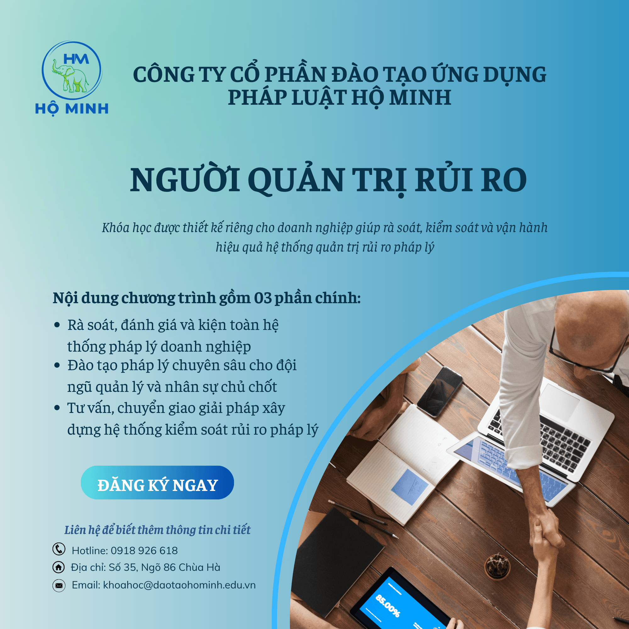 “Người quản trị rủi ro” là chương trình được thiết kế riêng cho doanh nghiệp và chủ doanh nghiệp nhằm xây dựng hệ thống kiểm soát rủi ro pháp lý trong hoạt động quản trị và kinh doanh. Nội dung chương trình tập trung vào việc rà soát và kiện toàn hệ thống pháp lý của doanh nghiệp, bao gồm hồ sơ pháp lý, quy trình quản trị nội bộ và các hoạt động kinh doanh trọng yếu. Các luật sư và chuyên gia tài chính nhiều năm kinh nghiệm sẽ trực tiếp tham gia đánh giá, phân tích và tư vấn các giải pháp phù hợp với từng doanh nghiệp. Bên cạnh đó, chương trình còn bao gồm hoạt động đào tạo và chuyển giao kiến thức nhằm giúp đội ngũ quản lý doanh nghiệp chủ động nhận diện và xử lý các rủi ro pháp lý trong thực tế. Đây là giải pháp giúp doanh nghiệp xây dựng nền tảng pháp lý vững chắc để phát triển ổn định và bền vững.